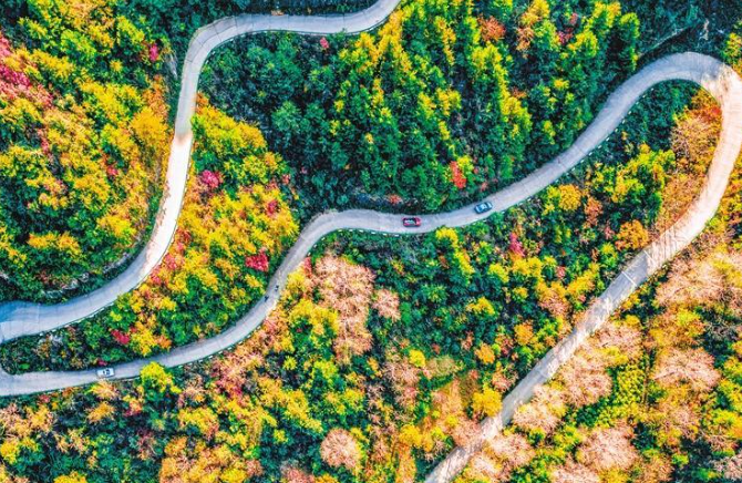 金秋十月,秋高气爽,在这缤纷的季节,秦岭北麓的景致格外动人,秋日山峦在温柔的秋风中,像是开启了油画滤镜,五彩斑斓的色彩从公路一直延伸到秦岭深处。