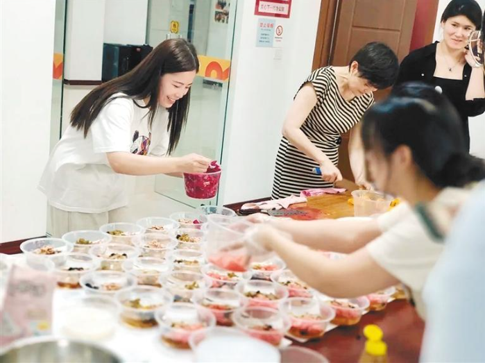 从冰粉、凉茶的制作再到配料的配备,社区工作者分工合作,烧水、配茶、切水果忙得不亦乐乎。晶莹透亮的冰粉上面添上西瓜、火龙果、水蜜桃、椰果、葡萄等水果,让这些饮品好喝又好看。