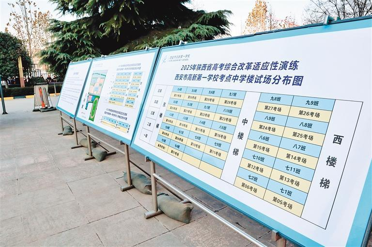 1月2日下午,在2025年陕西高考综合改革适应性演练西安市高新第一学校考点,记者看到,考场外已经拉起了警戒线,悬挂着醒目的标语横幅,考试纪律、考场分布图被公布在展板上,一目了然。
