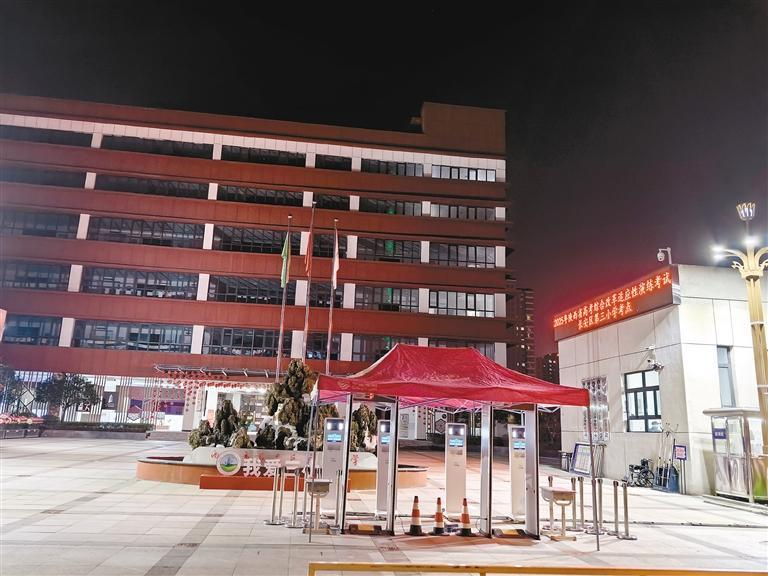 此次演练安检很严格。据倪涛介绍,考生在进入考点时须持身份证和准考证,首先要在校门处接受人脸识别系统检测,随后在操场上通过安检门检测,如安检门发出异响,工作人员会对考生进行人、物分离检查。进入考场前,监考人员会再次核对考生身份信息,一名女性监考人员会用金属探测仪对考生再次进行检查,一切无误方可入内。