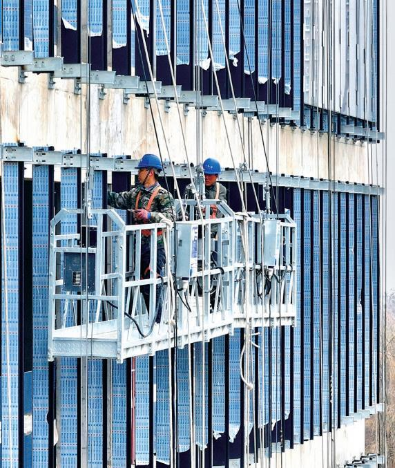 2月23日,在佳龙·EMC城市广场项目现场,工人在进行玻璃幕墙安装工作。