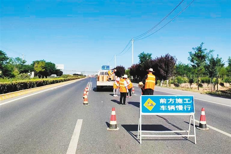 在进行抗裂贴作业时,需要摆放好警示标志,确保施工安全。 记者 冯晓瑞 摄