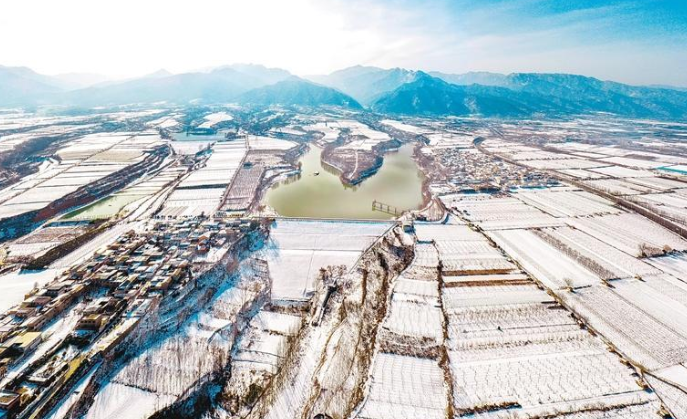 1月16日,雪后初霁,长安区引镇街道徐家沟水库周边的农田、民居呈现出茫茫雪原的景象,秦岭北麓一片银装素裹。