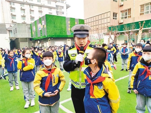 碑林交警在东厅门小学利用开学典礼,给学生们上了一堂“交通安全第一课”。(通讯员 张子卿 摄)