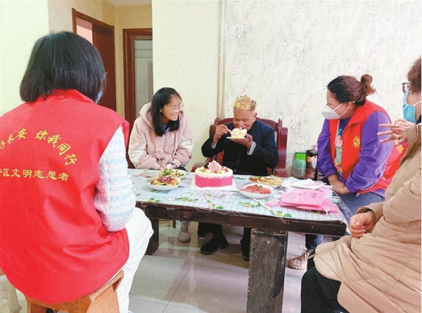 吃完饭后,社区工作人员将早已准备好的蛋糕端上桌,大家齐声为老人唱起生日快乐歌,还一起合影,记录下这幸福圆满的瞬间……