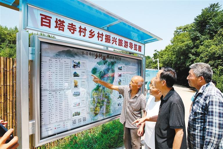 村民查看百塔寺村乡村振兴手绘旅游导览图。 ( 首席记者 李明 实习生 刘思宇 摄)