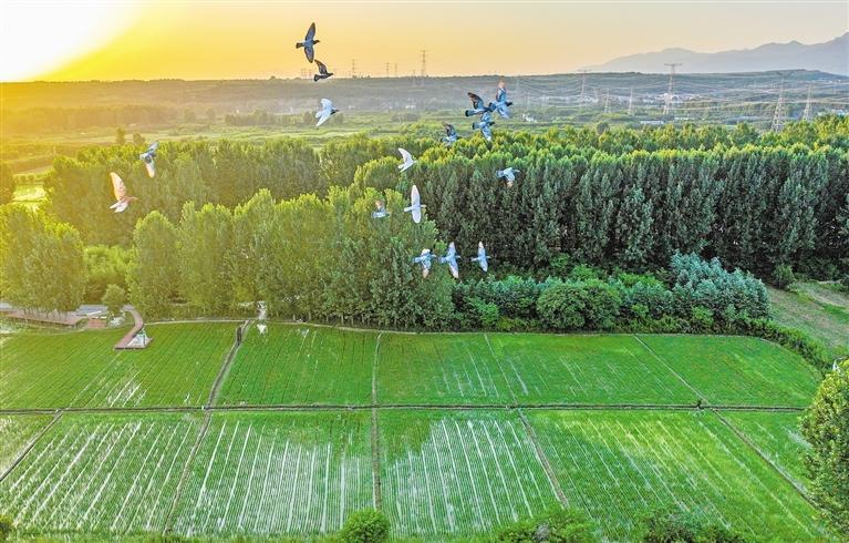 7月8日清晨,金色阳光洒满大地。位于西安市长安区王曲街道滈河河畔的十里蛤蟆滩,微风轻拂、稻苗摇曳,一群鹭鸟围着200亩稻田展翅飞翔……近年来,西安市长安区王曲街道通过滈河河道综合治理、农田改造等一系列工程,持续改善生态环境。 记者 袁景智摄