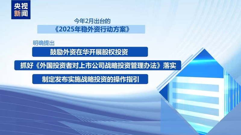 今年2月出台的《2025年稳外资行动方案》明确提出:鼓励外资在华开展股权投资,抓好《外国投资者对上市公司战略投资管理办法落实》,制定发布实施战略投资的操作指引,还提出取消外商投资公司使用境内贷款限制、鼓励外国投资者投资设立投资性公司、便利外国投资者在华实施并购投资等。