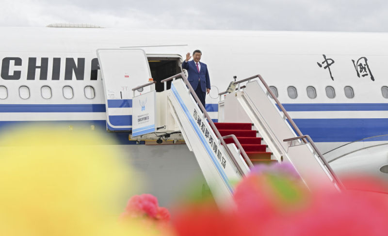 8月20日中午,中共中央总书记、国家主席、中央军委主席习近平率中央代表团乘专机抵达拉萨,出席西藏自治区成立60周年庆祝活动。这是习近平走出舱门,向欢迎群众挥手致意。新华社记者 殷博古 摄