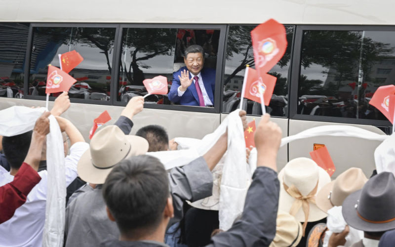 充满节日氛围的古城拉萨,从机场到住地主要街道两旁彩旗舞动,各族群众手持红旗、捧着哈达,齐声欢呼,表达欢迎和感激之情。习近平打开车窗,向沿途群众频频挥手致意。