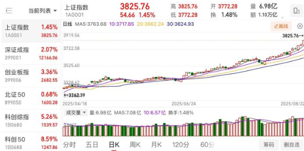 8月22日,A股上涨,沪指突破3800点,再创10年新高。
