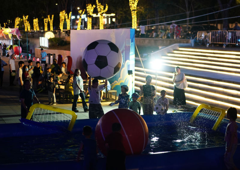 8月17日,在江苏南京举行的2025江苏省城市足球联赛第九轮比赛中,南京队对阵盐城队。南京市在部分商场、街区等地设置观赛“第二现场”,使用大屏幕同步直播赛事,同时设有游戏互动区、烟火市集区,让球迷们度过欢乐时光。新华社记者 季春鹏 摄