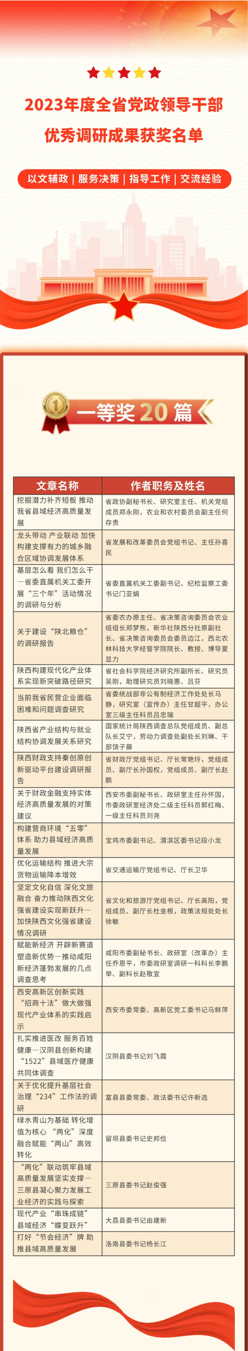 为深入贯彻落实党中央关于在全党大兴调查研究的决策部署,巩固拓展主题教育成果,激励各级党政领导干部更加注重调研、自觉带头调研、深入基层调研,营造浓厚调研氛围,按照省委关于大兴调查研究工作的有关部署要求,省委政策研究室和省政府研究室联合组织2023年度全省党政领导干部优秀调研成果评选工作。依据评选规则,通过对各级各部门上报的520篇调研报告进行初评、中评和总评复审,最终确定一等奖20篇、二等奖55篇、三等奖75篇。