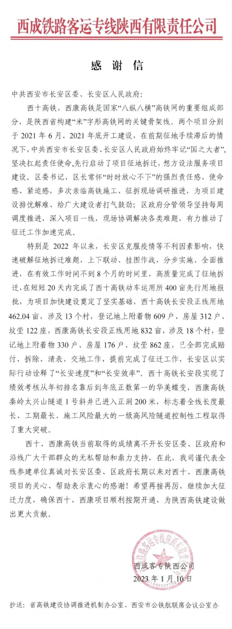 春节前,西成铁路客运专线陕西有限责任公司给中共西安市长安区委、长安区人民政府发来了感谢信,对长安区委、区政府长期以来对西十、西康高铁项目的鼎力支持,沿线广大干部群众的无私帮助表示衷心的感谢。