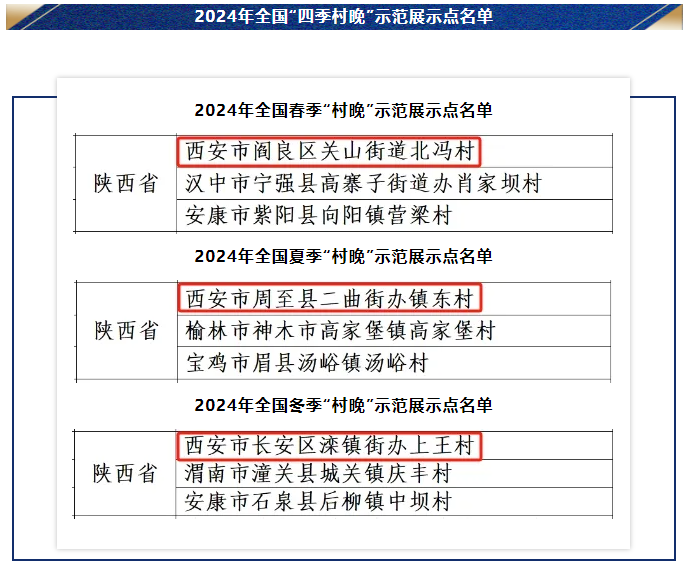 近日,文化和旅游部公布2024年全国“四季村晚”示范展示点名单。我市阎良区关山街道北冯村入选2024年全国春季“村晚”示范展示点;周至县二曲街办镇东村入选2024年全国夏季“村晚”示范展示点;长安区滦镇街办上王村入选2024年全国冬季“村晚”示范展示点。