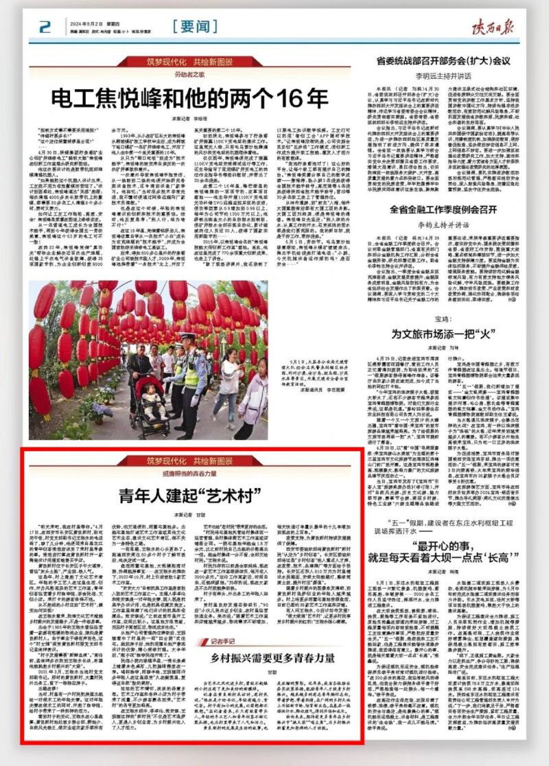 《陕西日报》5月2日02版要闻,以《青年人建起“艺术村”》为题,对我区抓党建促乡村振兴,吸纳扶持青年(乡村)创客,为追梦创业的年轻人创造发展空间,让更多村民享受乡村振兴红利的典型事例进行专题报道。全文如下: