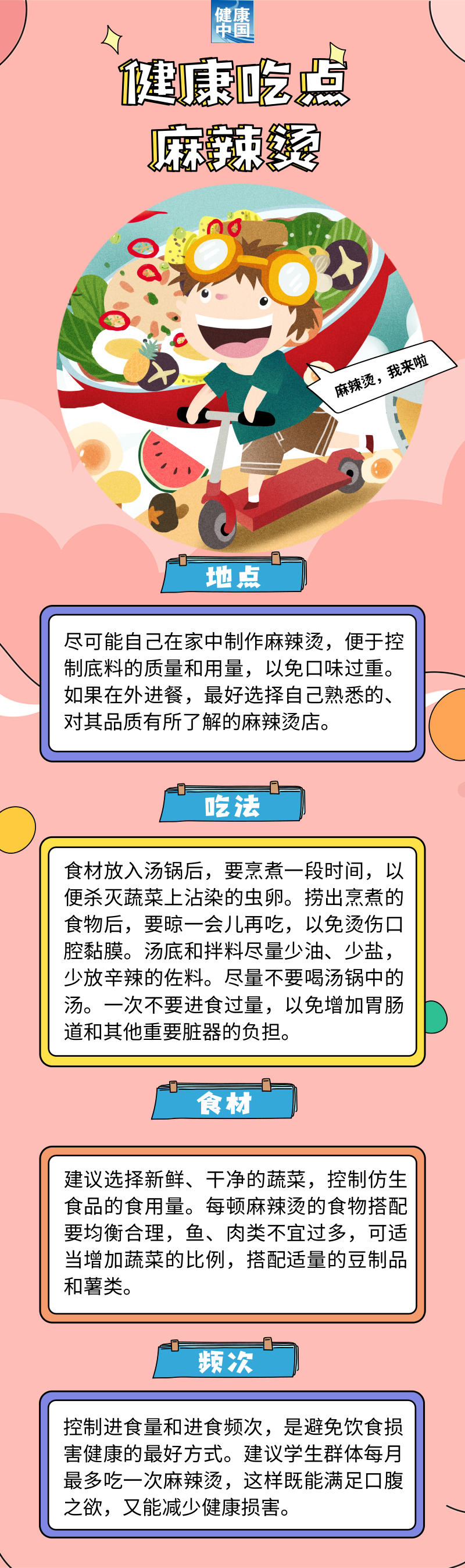 麻辣烫食材种类多样,包括各种肉类、鱼丸、鹌鹑蛋、平菇、金针菇、红薯、冬瓜以及各类豆制品、新鲜蔬菜等,孩子和家人可以根据自己的喜好随意选择,做到平衡膳食,营养合理搭配。