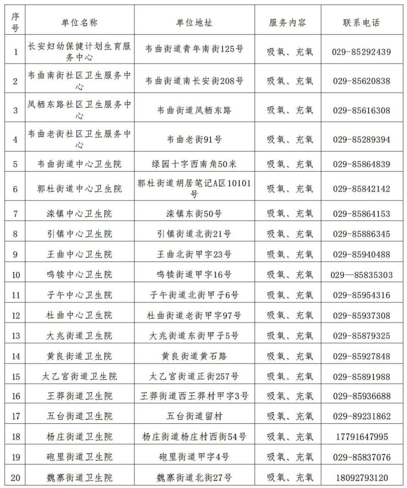 为更好地满足长安区居民的氧疗需求,全区有20家医疗卫生机构均设置氧疗区,配置了制氧设备,可24小时提供吸氧和充氧服务。各街道辖区居民可根据需要前往就近的医疗卫生机构。