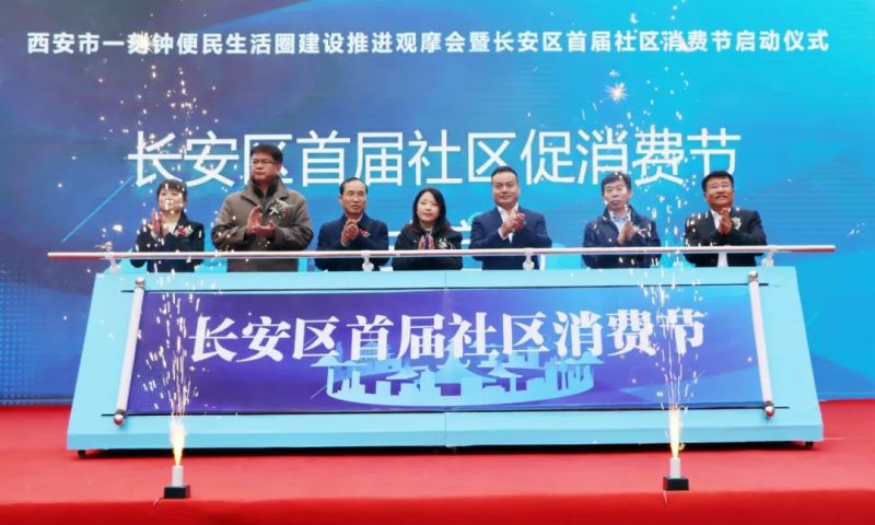与会领导、专家学者共同启动“西安一刻钟便民生活圈建设推进大会暨长安区首届社区消费节”活动。