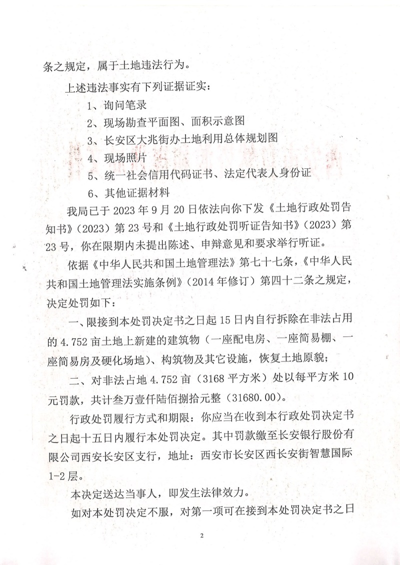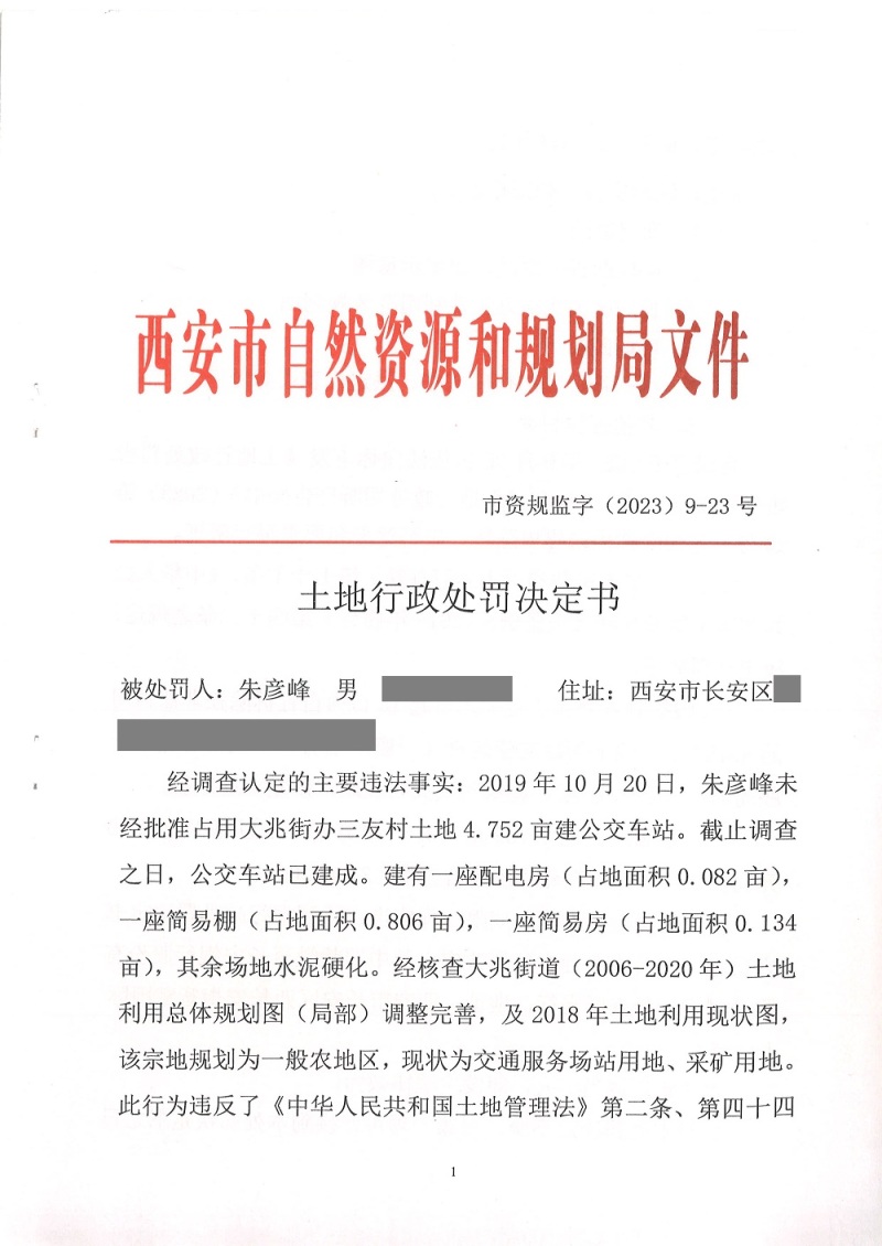 西安市自然资源和规划局长安分局行政处罚决定书(市资规监字【2023】9-23号)公示