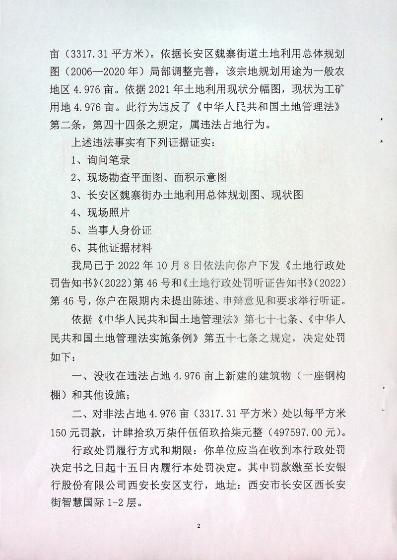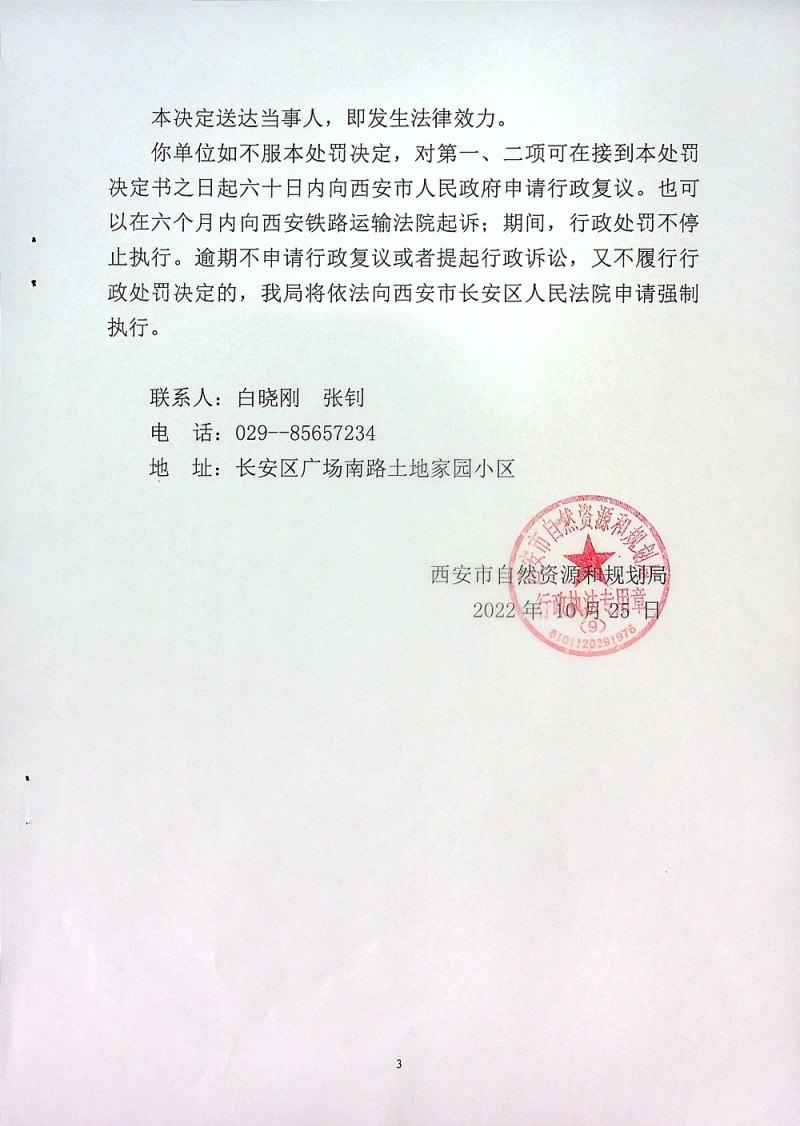 西安市自然资源和规划局长安分局行政处罚决定书(市资规监字【2022】9-46号)公示