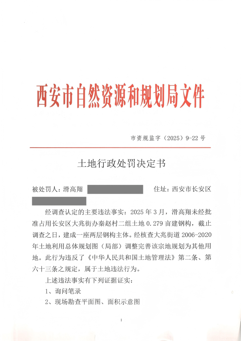 西安市自然资源和规划局长安分局行政处罚决定书(市资规监字【2025】9 - 22号)公示