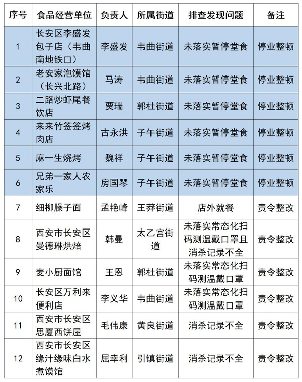 西安市长安区市场监督管理局关于对落实疫情防控措施不到位的食品经营单位的通报