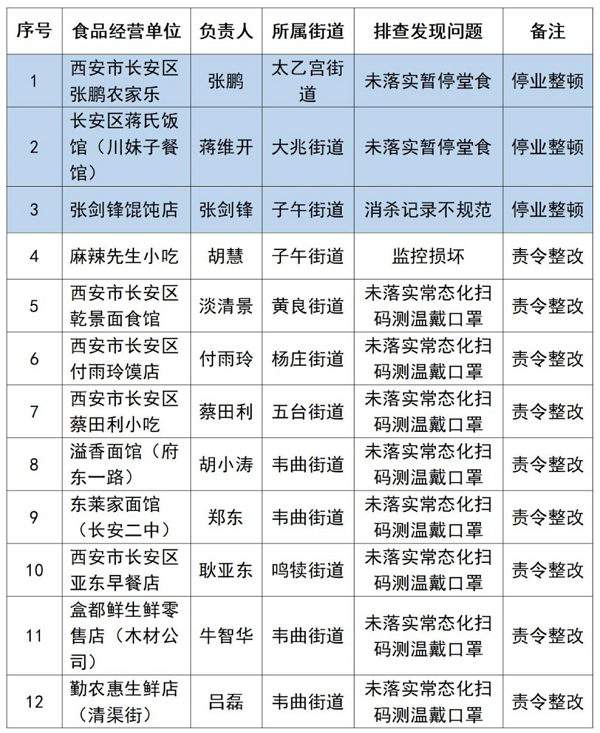 为做好市场领域疫情防控工作,按照西安市长安区疫情防控指挥部要求,西安市长安区市场监督管理局严格督促食品经营单位落实疫情防控各项措施,2022年10月20日,对辖区食品经营单位疫情防控落实情况继续进行全面排查,发现12家单位未严格落实各项疫情防控措施,现予以通报: