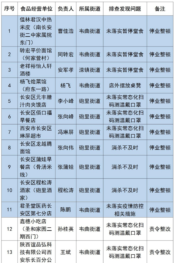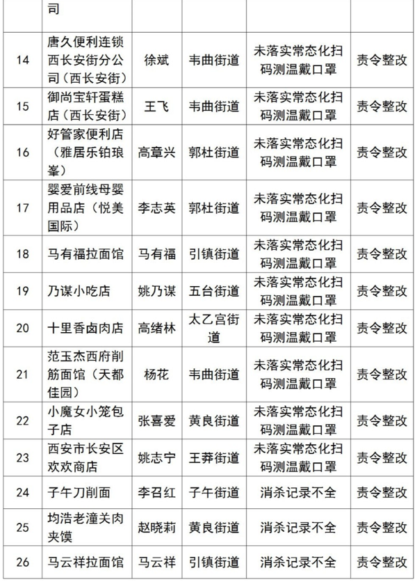 西安市长安区市场监督管理局关于对落实疫情防控措施不到位的食品经营单位的通报