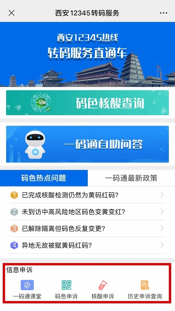 近期西安疫情反复,市民朋友对于“一码通”相关诉求较多,为了更好地服务广大市民朋友,西安市大数据资源管理局上线“转码服务直通车”模块,通过市大数据局微信公众号、西安12345微信公众号为群众提供“一码通”在线咨询、自助问答、在线申诉以及最新政策通知等功能。