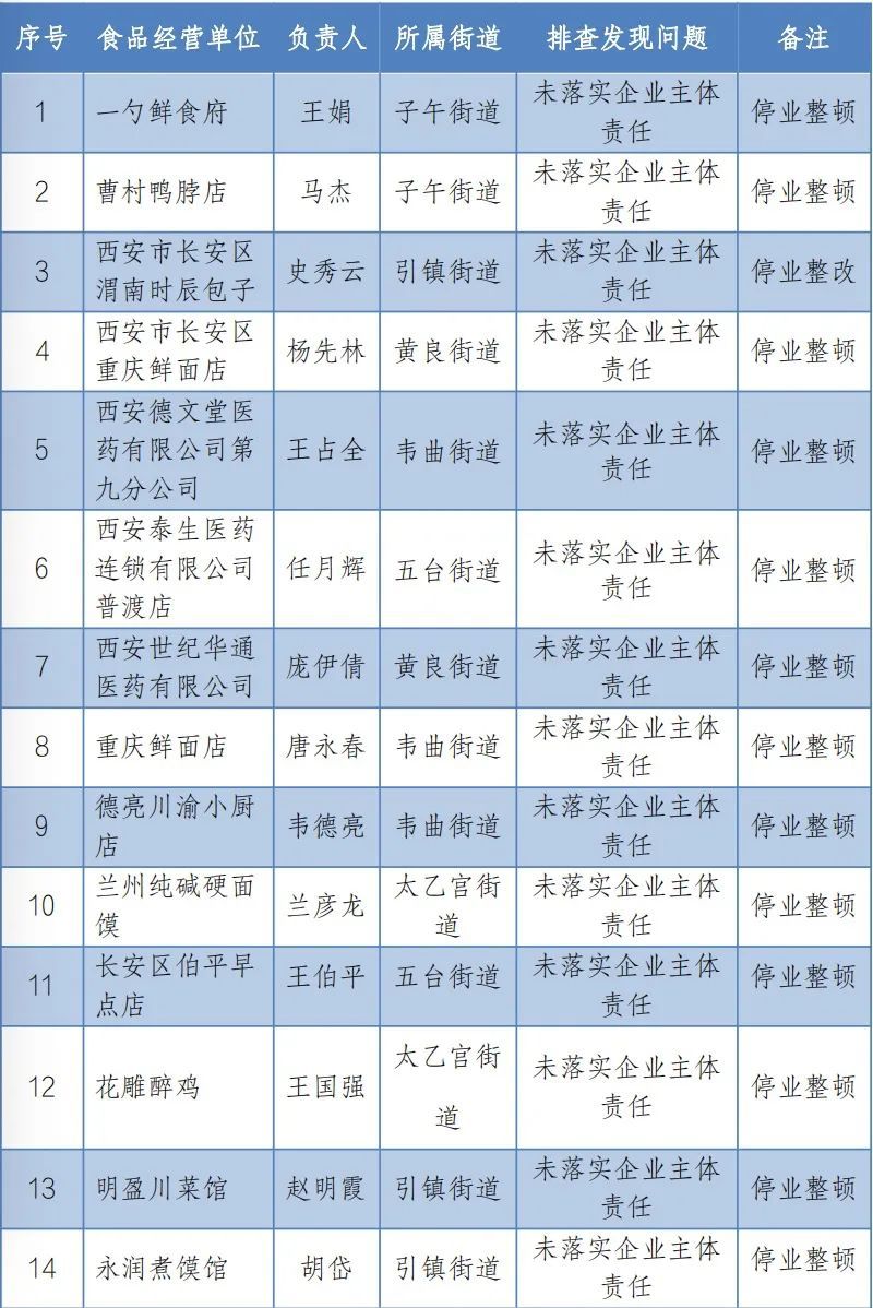 为做好市场领域疫情防控工作,按照西安市长安区疫情防控指挥部要求,西安市长安区市场监督管理局严格督促食品药品经营单位落实疫情防控各项措施。2022年11月22日至23日,对辖区食品药品经营单位疫情防控落实情况继续进行全面排查,发现14家单位未严格落实企业主体责任,现予以通报: