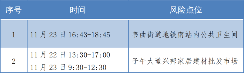 11月21日0时—24日24时,我区下列点位涉及疫情传播风险元素,请11月22日13时以来,在相关时间范围内去过相应风险点位的个人,主动向村组(社区)报备,严格落实“3天健康监测”,第1、2、3天各开展一次核酸检测,做到不聚会、不聚餐、不去人员密集公共场所、不乘坐公共交通工具。希望广大群众自觉遵守相关法律规定,关注官方信息,不造谣、不信谣、不传谣,主动落实疫情防控相关措施。