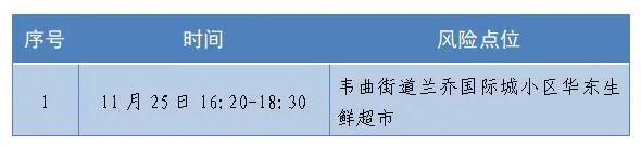 11月23日0时—26日24时,我区下列点位涉及疫情传播风险元素,请11月25日16时以来,在相关时间范围内去过相应风险点位的个人,主动向村组(社区)报备,严格落实“3天健康监测”,第1、2、3天各开展一次核酸检测,做到不聚会、不聚餐、不去人员密集公共场所、不乘坐公共交通工具。希望广大群众自觉遵守相关法律规定,关注官方信息,不造谣、不信谣、不传谣,主动落实疫情防控相关措施。