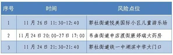 11月24日0时—27日24时,我区下列点位涉及疫情传播风险元素,请11月24日0时以来,在相关时间范围内去过相应风险点位的个人,主动向村组(社区)报备,严格落实“3天健康监测”,第1、2、3天各开展一次核酸检测,做到不聚会、不聚餐、不去人员密集公共场所、不乘坐公共交通工具。希望广大群众自觉遵守相关法律规定,关注官方信息,不造谣、不信谣、不传谣,主动落实疫情防控相关措施。