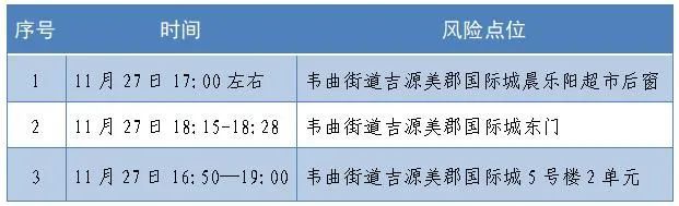 11月27日0时—27日24时,我区下列点位涉及疫情传播风险元素。请11月27日0时以来,在相关时间范围内去过相应风险点位的个人,主动向村组(社区)报备,严格落实“3天健康监测”,第1、2、3天各开展一次核酸检测,做到不聚会、不聚餐、不去人员密集公共场所、不乘坐公共交通工具。希望广大群众自觉遵守相关法律规定,关注官方信息,不造谣、不信谣、不传谣,主动落实疫情防控相关措施。