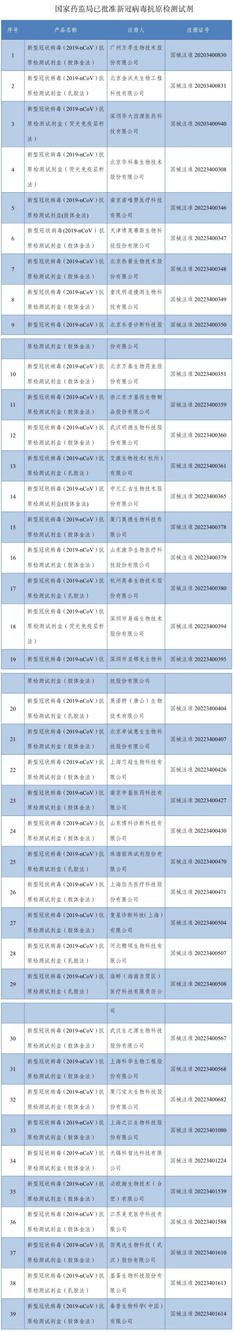 国家药监局已批准39个新冠病毒抗原检测试剂