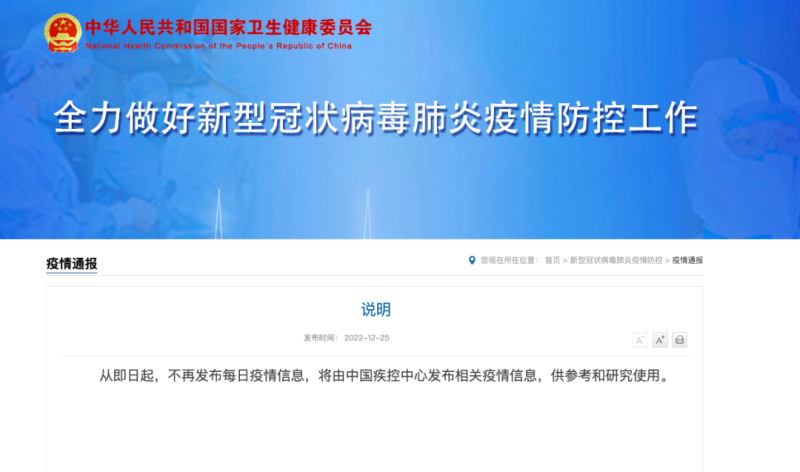 国家卫健委官网12月25日发布说明:从即日起,不再发布每日疫情信息,将由中国疾控中心发布相关疫情信息,供参考和研究使用。