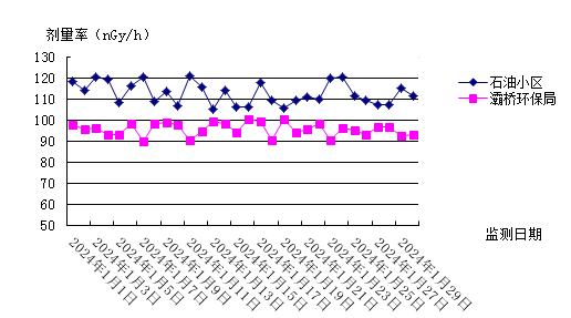 1月份全市2个辐射环境自动监测站点运行状况稳定,监测结果在正常水平范围内波动,陆地γ剂量率日平均值为0.0902~0.1210μGy/h,月平均值为0.1043μGy/h。