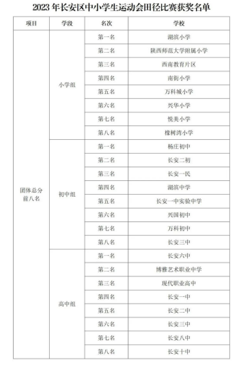 4月25日-27日,2023年长安区中小学生运动会田径比赛顺利举行,各学段团体总分前八名名单揭晓。