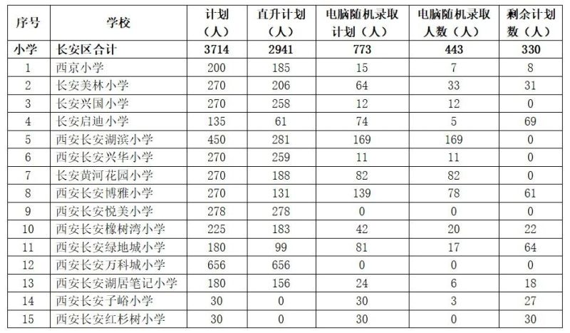 现将西安市长安区2024年民办小学电脑随机录取人数和剩余计划数公布如下: