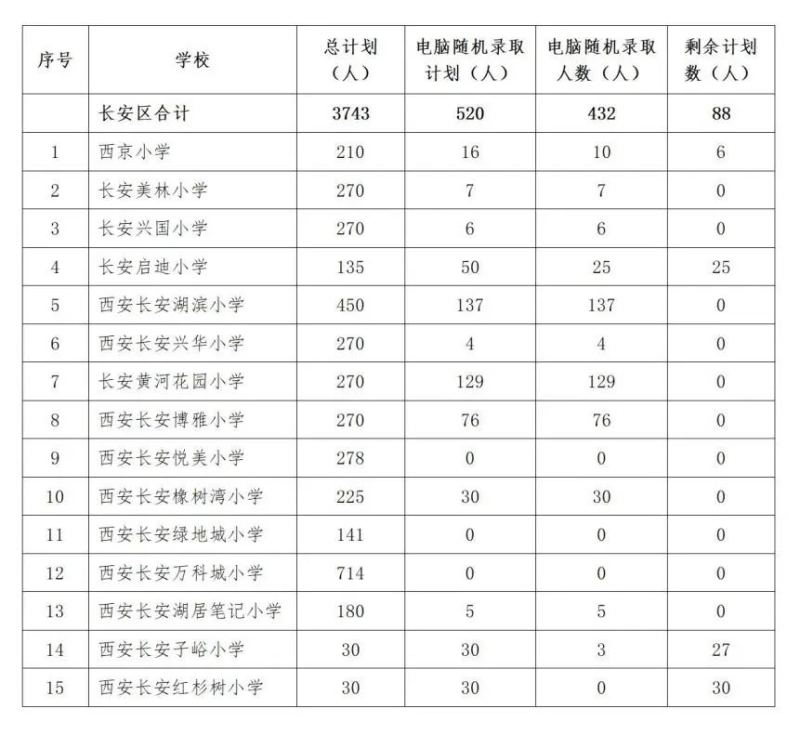 现将西安市长安区2023年民办小学电脑随机录取人数和剩余计划数公布如下: