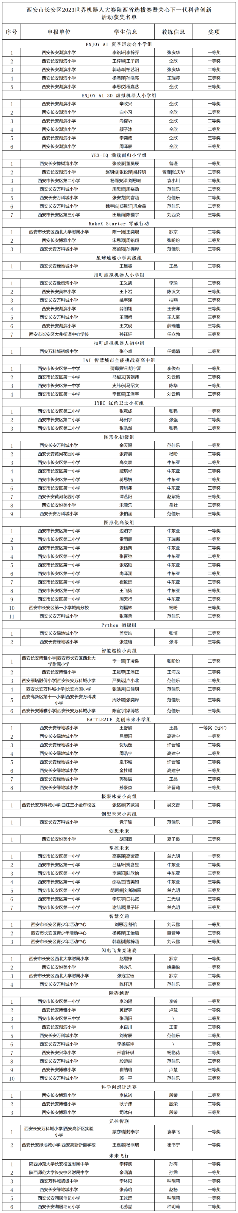 2023世界机器人大赛陕西省选拔赛暨关心下一代科普创新活动圆满结束,长安区共获123个奖项,其中科普创新活动获奖111个,11名教师被评为优秀指导教师,1名教师被评为先进个人。长安区青少年活动中心、长安一中、长安一小、长安湖滨小学、长安绿地城小学被评为优秀学校。长安区教育局被评为优秀组织单位。