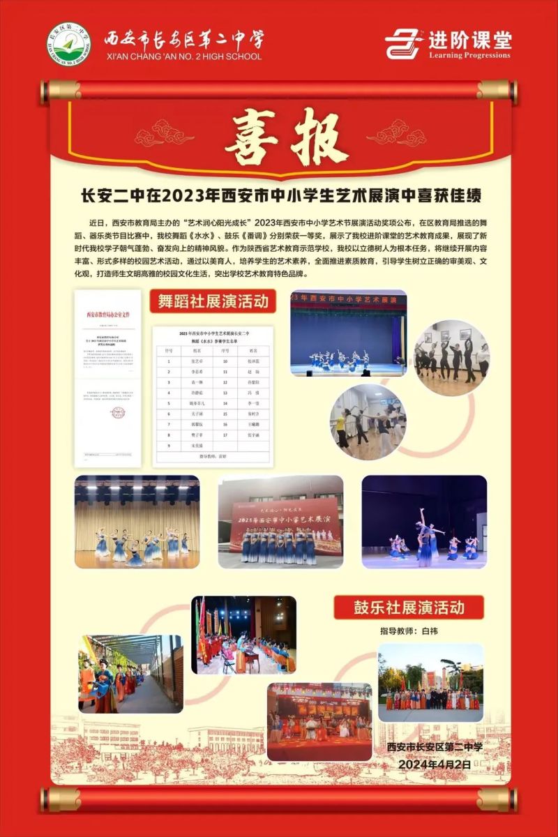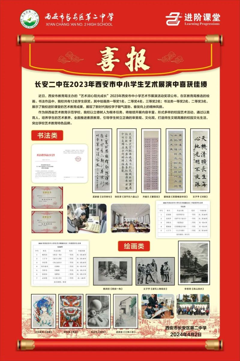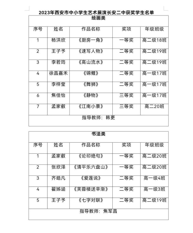 近日,西安市教育局主办的“艺术润心 阳光成长”2023年西安市中小学生艺术展演活动奖项公布,在区教育局推选的舞蹈、器乐、绘画、书法作品中,长安二中舞蹈《水水》、鼓乐《番调》分别荣获一等奖;书画类共有12名学生获奖,其中书法类一等奖2名、二等奖3名,绘画类一等奖1名、二等奖4名、三等奖2名。展示了我校进阶课堂的艺术教育成果,展现了新时代我校学子朝气蓬勃、奋发向上的精神风貌。