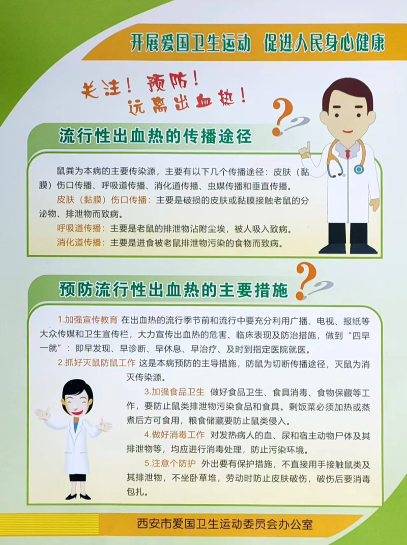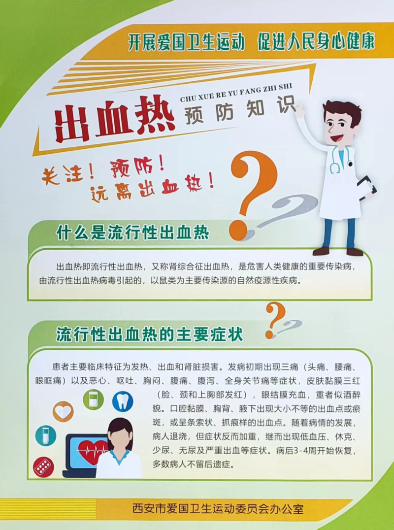 二是细化任务,联防联控。要组织引导群众做好全区城乡环境卫生大整治工作,完善重点区域防鼠设施,下力狠抓防鼠灭鼠;强化出血热疫苗接种知识普及宣传,深入推进疫苗接种,提高接种主动性和覆盖面;加强全区医疗机构对出血热等传染病的筛查工作,落实早发现、早治疗、就近就医等防控措施,对出现症状的患者进行及时有效的治疗。