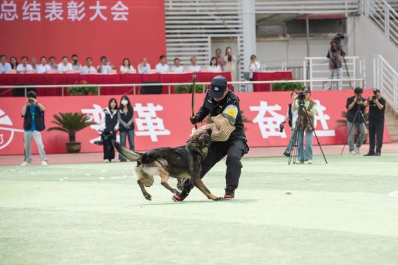 分局巡特警处突队带来的警犬训练科目表演,一亮相便赢得了全场师生的热烈喝彩。威风凛凛的东德(牧羊犬)、矫健机敏的马犬,出色完成了服从、扑咬、追捕、辨认和制伏等警务训练课科目。警犬们憨态可掬的动作、狠准的扑咬、与训导员的完美配合,都为师生们留下了深刻的印象,增深了广大师生对公安工作的了解,以及对公安机关维护安全稳定的信心。