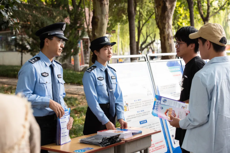 与此同时,在学院东区的诒鸣广场上,分局刑侦、禁毒、网安、出入境及属地太乙宫派出所等部门设立的平安校园主题展区,也引得同学们纷纷驻足观摩,了解学习。为了向学院师生们深入宣传反诈防骗、禁毒反邪、防盗减灾等校园安全知识,各警种通过陈列展板、悬挂横幅、发放手册、派送礼品及现场互动等师生喜闻乐见的方式开展宣传教育,共发放宣传手册3800余份,解答咨询70余人次,受众8000余人,主题宣传取得了很好效果。
