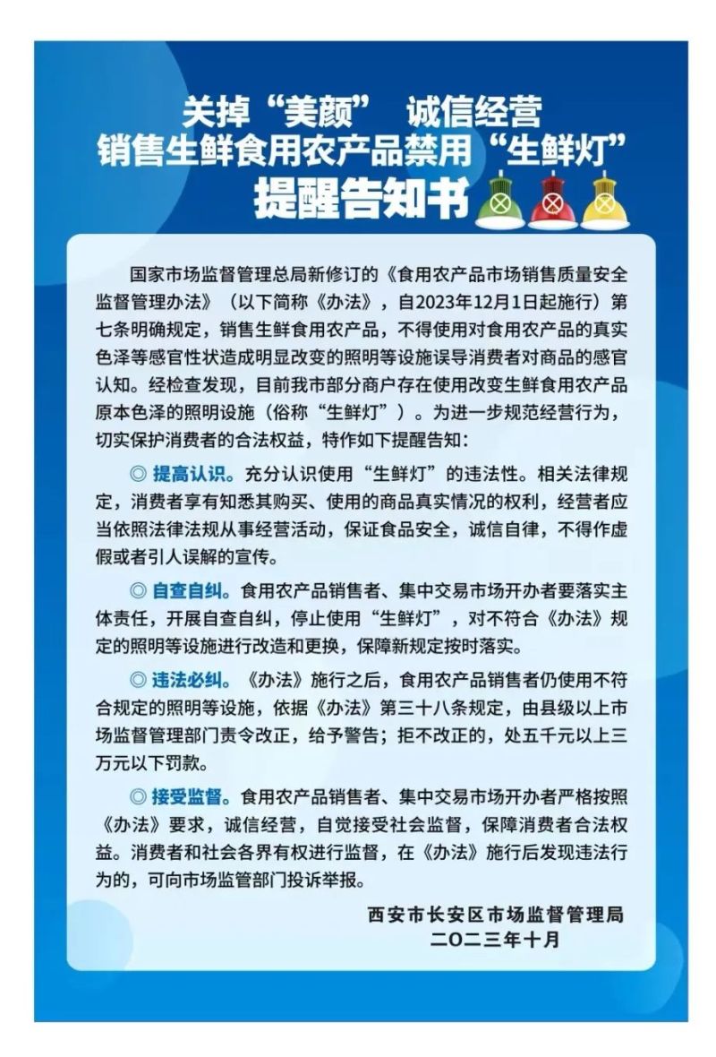 国家市场监管总局新修订的《食用农产品市场销售质量安全监督管理办法》(以下简称办法)将于2023年12月1日起正式实施。《办法》明确规定,“销售生鲜食用农产品,不得使用对食用农产品的真实色泽等感官性状造成明显改变的照明等设施,误导消费者对商品的感官认知”。长安区市场监督管理局提醒各食用农产品经营户,如果还在使用“生鲜灯”的请尽快更换改造,保障新规定按时落实。