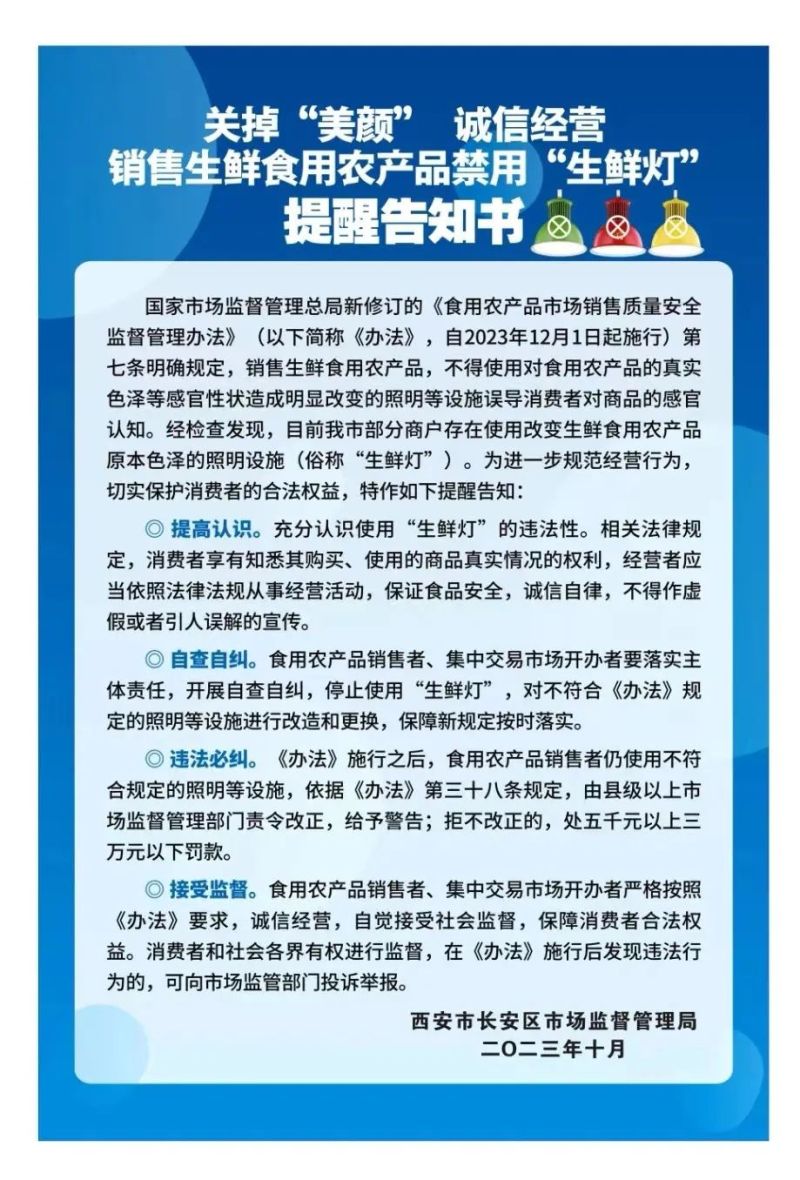 发布一份提醒函:制作了题为《长安区食用农产品经营户注意啦!12月1日起,禁止使用生鲜灯》的提醒函,通过《今朝长安》,向全区食用农产品经营户进行广泛宣传,提醒各食用农产品经营户,按照《办法》规定的时间节点,尽快改造更换“生鲜灯”,保证新规定按时落实。