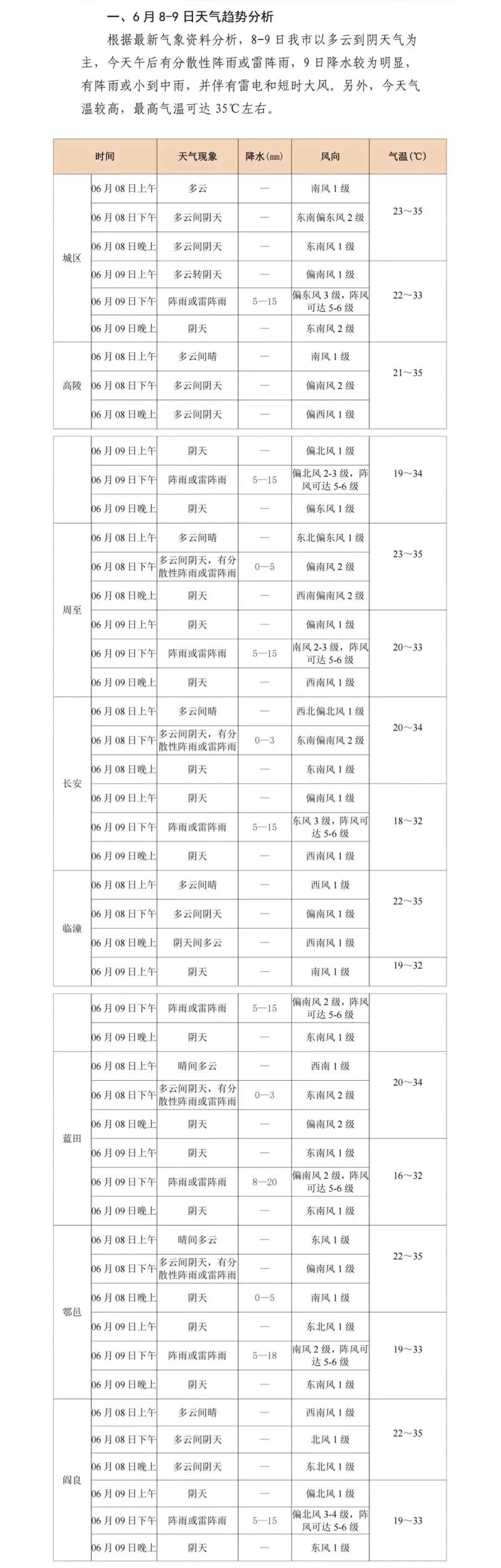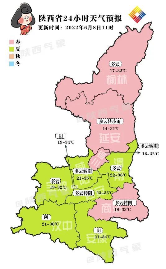 9日:全省阴天间多云,陕北南部、关中部分、陕南部分地方有阵雨或雷阵雨,陕南南部局地有中雨。关中东部部分地方有35℃以上的高温天气。陕北大部有4级左右偏北风。