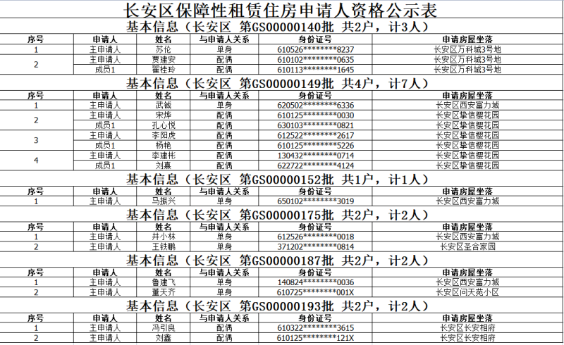 为确保保障性租赁住房资格申请工作公开、公正、公平进行,依据《西安市保障性租赁住房资格审核及分配暂行规定》(市建发〔2022〕169号)的通知,经区住房保障中心核实,将下列申请人资格在政府门户网站进行公示。公示期为三日,自发布之日计起,请广大群众监督或投诉。如对公示有异议,请向区住房保障中心(地址:长安区西长安街145号)反映。